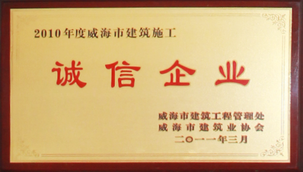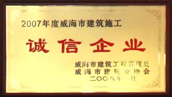 公司連續八年榮獲威海市“誠信開發企業”、“建筑施工誠信企業”,連續九年被評為威海市級“守合同重信用企業”,多次被評為威海市“市級文明單位”、“質量管理先進企業”、 “安全管理先進企業”,乳山市“優秀企業”、“先進民營企業”、“納稅明星企業”,在社會上逐步樹立了誠信、穩健的企業形象。